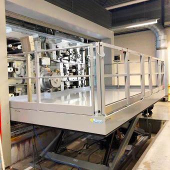 Im Mittelpunkt stand der Aufbau der Maschine von Flexoplast. Ein Hydraulikzylinder, der aus der Maschine herausragte, verhinderte, dass die neue Arbeitsplattform nah genug installiert werden konnte. Somit war ein effizientes und ergonomisches Arbeiten nicht möglich. „In Zusammenarbeit mit VPG haben wir eine Arbeitsbühne mit einer Aussparung für den Hydraulikzylinder entworfen“, sagt Maurice. „Dadurch kann die Arbeitsbühne sehr nah an die Maschine installiert werden. Ohne Risiko, dass der Hydraulikzylinder beschädigt wird, kann die Plattform der Arbeitsbühne nun sehr nah an der Maschine vorbeifahren.“